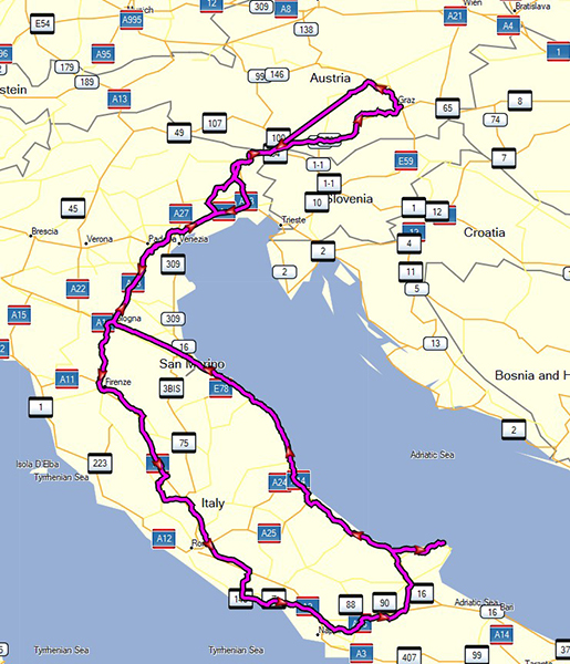 Graz – Fisching – Judenburg – Scheifling – Villach – Padova– Florenz – Orvieto – Bolsena – Caserta – Foggia – Peschici – Pescara – Bologna – Padova – Cimpello – Spilimbergo – Gemona – Tarvis – Arnoldstein – Villach – Graz