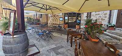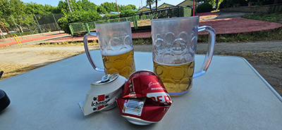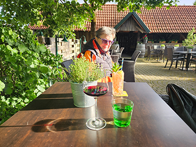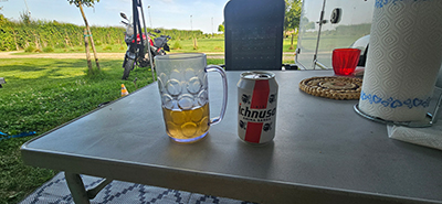 In der Früh kamen noch ein paar Tropfen nach , es wurde aber bald trocken. Aber es war richtig kalt gegen die letzten Tage, dh. Frühstück drinnen im Warmen. Helga hat danach noch ein wenig gearbeitet, da sie gestern nicht fertig wurde wir aber abfahren wollten. Ich habe die Honda abgeladen, auch wenn es uns zum Fahren heute noch zu kalt war. Am Nachmittag haben wir angefragt ob wir einen Platz im Lokal kriegen würden, aber außer sehr früh, oder ganz spät war nichts zu machen. Egal, wir finden auch ein anderes Lokal das einen Platz für uns hat. Wir haben das dann mit einen Spaziergang nach Weißkirchen verbunden, und bei der Grillbude beim Kreisverkehr bei der Tankstelle gut und günstig gegessen. Es war alles frisch und es war auch sehr sauber, da kommen wir sicher noch öfter her. Am Rückweg wollten wir noch etwas trinken am Campingplatz, mussten aber draußen sitzen bleiben da drinnen die Plätze für Leute die Essen wollen reserviert waren. Der Nachteil davon war, dass der an sich gute Zirhinja bei den Temperaturen nicht funktioniert. Das Eis, von dem sehr viel im Glas ist, schmilzt sehr langsam, und so hat man am Anfang ein sehr starkes Getränk, dann aber sehr schnell nur mehr fades Eis und Eiswasser. Und die Öko Röhrl sind sowieso nur ein ewiges Ärgernis weil sie sich sofort zerlegen und beim Eiszerstoßen null Hilfe sind. Helga hätte besser auch ein Achterl Rot wie ich getrunken, das war gut, unempfindlich gegen die Temperatur, günstiger und hat mehr Freude gemacht. Aber auf ein Getränk wurden wir eingeladen, so wars nicht ganz so schlimm. Den Abend haben wir dann im Wohnmobil vorm Fernseher verbracht, und den eigenen Rotwein dezimiert.
