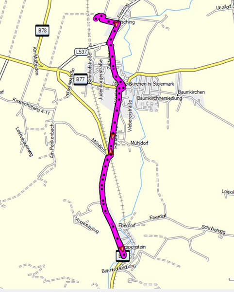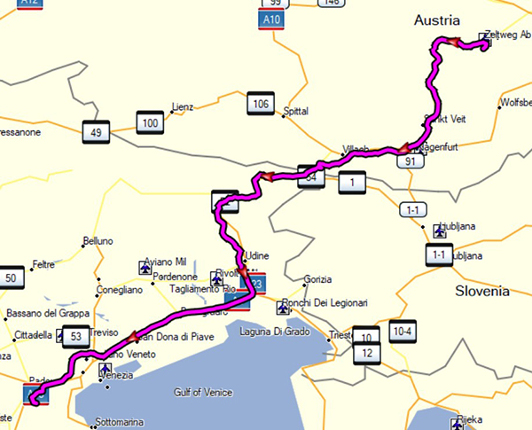 Graz – Fisching – Judenburg – Scheifling – Villach – Padova– Florenz – Orvieto – Bolsena – Caserta – Foggia – Peschici – Pescara – Bologna – Padova – Cimpello – Spilimbergo – Gemona – Tarvis – Arnoldstein – Villach – Graz