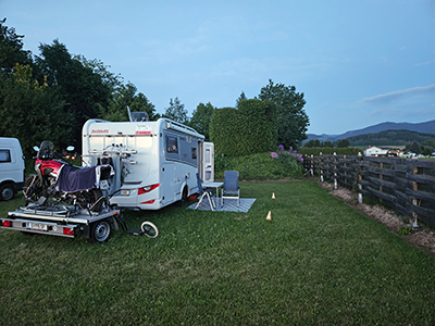 Ich hatte den Mittwoch schon frei genommen, Helga musste aber heute noch arbeiten, deswegen ging es erst um 16:00 Uhr los. Es war aus Graz raus ein ziemlicher Stau mit stockendem Verkehr, aber kaum auf der Autobahn hatten wir freie Fahrt. Aber auch nur deswegen weil wir gegen die Hauptrichtung nach Norden fuhren 🙂 . Richtung Süden war fast stehender Verkehr weit hinauf die A9. Wir wollten zum Start in den Urlaub noch über das lange Wochenende nach Fisching fahren, bevor es dann in den Süden geht. Das Einchecken am Camping 50 Plus war schnell erledigt und unseren bevorzugten Eckplatz bekamen wir auch. Am Abend war es richtig kühl, und wir waren froh über den vergessenen (das Rausgeben habe ich vergessen 🙂 ) Heizstrahler. Der Platz war recht voll, gut für die Betreiber, aber uns gefällt es ruhiger besser. In der Nacht hat es geregnet aber mit der Heizung war es recht angenehm und wir haben nach ein wenig fernsehen super geschlafen.