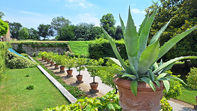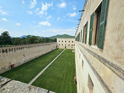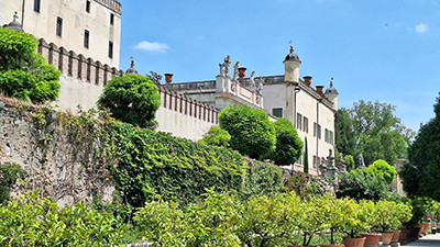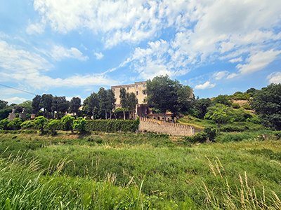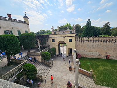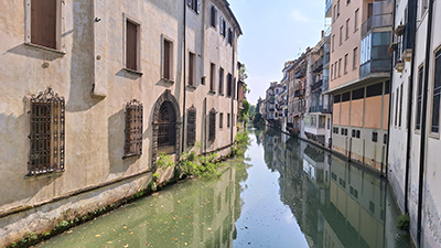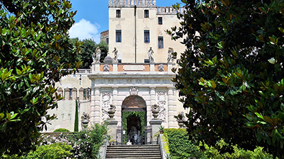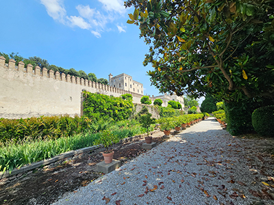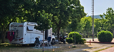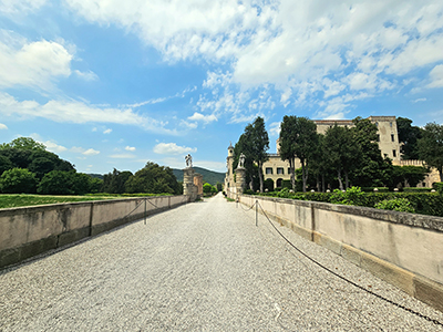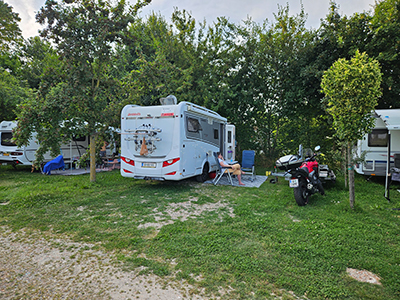 Da wir hier keinen Shop direkt am Platz haben, haben wir mit dem Omnia ein paar Brötchen aufgebacken und dann gemütlich vorm Wohnmobil im Schatten gefrühstückt. Dann sind wir mit der Honda und einer Kühltasche zum nahen Supermarkt gefahren, um die Vorräte wieder einmal aufzufüllen. Nachdem wir die Einkäufe verstaut hatten, sind wir los auf eine kleine Sightseeing Tour. Zuerst ging es Richtung Battiglia Therme. Kurz vor dem Ort haben wir das wunderschöne Castello del Catajo und den Park besichtigt. Das Parken kostet auch für Motorräder 1 €, der Eintritt 10 € pro Person. Nach einer Runde durch Battiglia Therme sind wir weiter nach Monselice gefahren, wo wir uns im Zentrum eingeparkt haben. Für eine Pizza waren wir leider ein paar Minuten zu spät, wobei uns eigentlich die Kellnerin genau so lange ignoriert hat bis sich das nicht mehr ausgegangen ist. Aber die warmen Sandwiches waren auch gut. Dazu gab es Cola und viel Wasser, da es jetzt wirklich warm geworden ist. Von hier sind wir wieder über kleine Straßen zum Campingplatz zurück gefahren. Dort haben wir um einen Tag verlängert und sind dann baden gegangen. Am Abend haben wir uns Nudeln mit Wildschwein Sugo und den restlichen Salat von zuhause gemacht. Dann haben wir ein paar Partien Backgammon gespielt bevor wir uns zum Schlafen zurück gezogen haben. Ab jetzt waren die Leintücher zum Zudecken genug, den auch die Nächte waren jetzt warm. Aber mit den beiden USB Ventilatoren haben wir einen angenehmen Durchzug gemacht, und so trotz der Temperatur gut geschlafen.