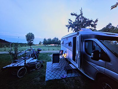 Da wir morgen Weiterfahren wollten, habe ich in der Früh, solange es noch nicht so heiß war, die Honda verladen. Sonst haben wir den Tag heute etwas ruhiger angehen lassen. Baden, ein wenig am Reisebericht schreiben, Mittags Nudeln mit Trüffeln machen und danach wieder Siesta machen. Später habe ich mir das F1 Rennen angesehen und dabei aber die Klimaanlage aktiviert. Ohne die wäre es im Wohnmobil nicht auszuhalten gewesen. Wir mussten noch ein paar Dinge aus dem Kühlschrank von zuhause verbrauchen, die vorm Ablaufen waren. So gab es heute ein für Italien etwas schräges Menü. Gebratene Scheiben von Käseleberkäse, mit kleinen Kartoffel Rösti und der restlichen Sauce Cumberland von unserem Fleischhauer des Vertrauens. Auch wenn es absolut nicht italienisch war, war es sehr gut. Am Nachmittag war heute irgendetwas anders, aber es hat ein wenig gedauert bis wir erkannt hatten was es war. Die nahen italienischen Dauercamper waren weg 🙂 , Es war wieder ruhig und leer am Platz und der heute etwas stärkere Wind hat auch für angenehme Temperaturen gesorgt