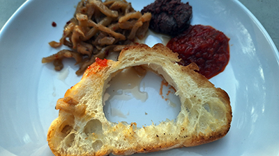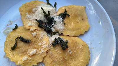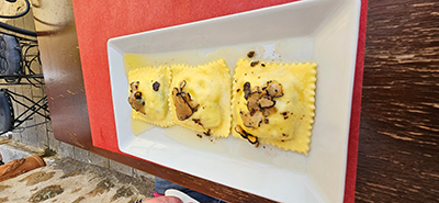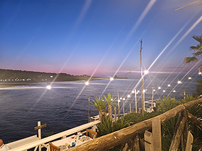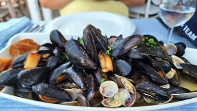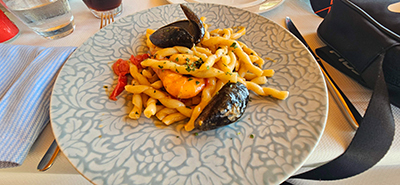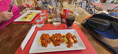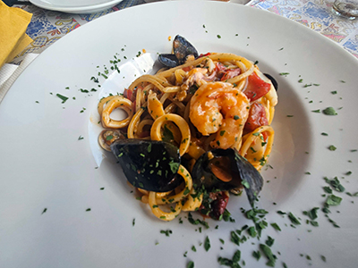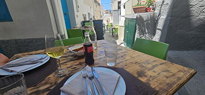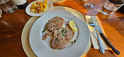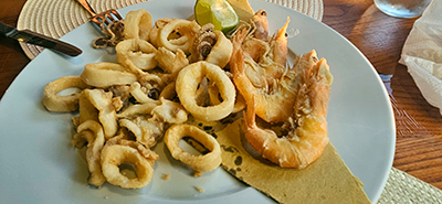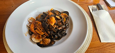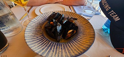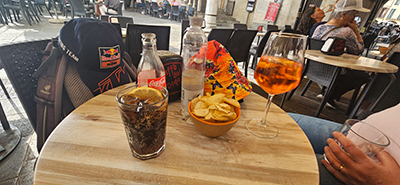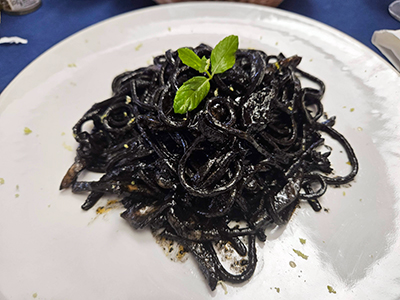 Am Abend waren wir faul, und die kurzfristige Frage ob es einen Tisch für uns gäbe, wurde positiv beantwortet. Da wir gestern gesehen haben das die Portionen recht ausgiebig sind, haben wir heute nur schwarze Nudeln 😉 und ein Fritto Misto bestellt, und dazu wieder einen Limoncello Spritz. In der Nacht hat der Vollmond bei der Dachluke hineingeleuchtet als ob wir direkt unter einer Straßenlaterne gestanden wären.