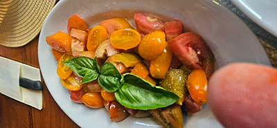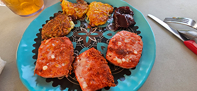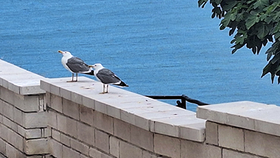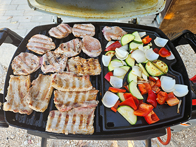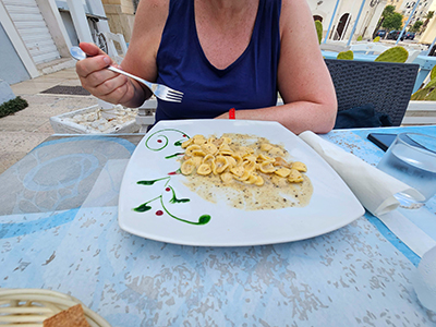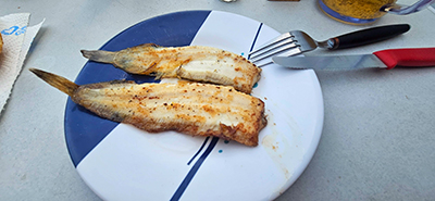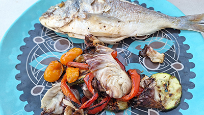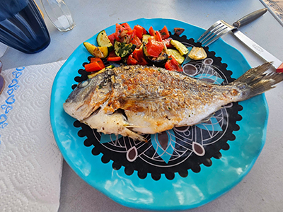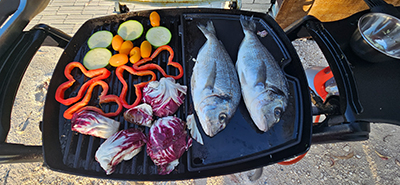 In der Früh vor dem Frühstück habe ich die Honda abgeladen, weil es noch kühler war und weil Helga noch ein wenig weiter schlafen wollte. Dann bin ich in den Shop und habe Brötchen, Croissants und 2 wunderschöne Goldbrassen gekauft. Pro Stück habe die heiße 4 € gekostet 🙂 . Zurück beim Wohnmobil habe ich sie aus ihrer Verpackung geholt und einvakuumiert. Wir haben seit heuer einen kleinen Vakuumierer mit, weil mir das für Obst, Fleisch oder „wohl riechenden“ Käse schon immer abgegangen ist. So hält alles länger und kann auch platzsparender verstaut werden. Danach haben wir gemütlich gefrühstückt, bevor wir Richtung Vieste gefahren sind. Nach knapp zwei Kilometern war ein Stau an dem ich wie alle Einspurigen langsam vorbei gerollt bin, bis wir gesehen haben was los ist. Ein scheinbar über motivierter Motorradfahrer die Kurve nicht mehr bekommen, und sein Gefährt unter ein entgegen kommendes Wohnmobil zwischen Vorder- und Hinterachse eingeparkt. Nachdem er hinter den Hinterrädern gelegen ist, möchte ich gar nicht näher wissen wie es ihm oder ihr gegangen ist. Es sind schon einige Leute herumgestanden oder haben geholfen, deswegen habe wir beschlossen das nicht abzuwarten sondern umzudrehen. Vorbeifahren war sowieso nicht möglich und so sind wir statt nach Vieste nach Peschici gefahren. Kurz vor Peschici, ca. 15 Minuten später ist uns die Rettung entgegengekommen, dh. noch weitere 15 Minuten bis sie beim Unfallort wäre. Ich hoffe das ist alles halbwegs gut ausgegangen. In Peschici haben wir uns eingeparkt und sind eine Runde durch das nette Örtchen gegangen. In einen kleinen Laden haben wir ein paar Kleinigkeiten eingekauft. In einem Restaurant ein paar steile Stufen hinunter haben wir einen schattigen Tisch bekommen, und etwas gegessen. Ich habe in der Karte Cozze ripiene gesehen, laut Übersetzung gefüllte Muscheln nach Gargano Art, und das neugierig bestellt. Helga hat wieder einmal Nudeln mit den kleinen Muscheln bestellt, ihr Favorit in dem Urlaub 🙂 . Als die Muscheln dann gekommen sind, war ich ein wenig erstaunt und habe gleich vergessen ein Foto zu machen. In einer schönen Keramikschüssel waren 6 oder 7 Miesmuscheln komplett gefüllt mit einer Mischung aus altbackenem Brot, Knovl, Petersilie, Pfeffer und ein wenig typischen regionalen Käse (Caciocavallo Podolico). Darunter war eine würzige stückige Tomatensauce, die mit dem Muschelwasser, das beim Öffnen der rohen Muscheln anfällt, verfeinert wird. Es waren wirklich ausgezeichnet, und obwohl ich schon oft in Italien war habe ich so etwas davor noch nie gegessen oder auf einer Karte gesehen. Inzwischen ist das Lokal leerer geworden, und bis auf einen Mann der irgendwie zum Lokal gehört hat, oder eine lokale Dorfgröße war, waren wir alleine. Der hat dann mit den Angestellten und auch den Köchen zum Streiten angefangen. Es wurde immer lauter und hitziger, bis wir beschlossen haben zu gehen weil das unangenehm wurde. Wir waren sowieso fertig, und das war schon mehr als eine typische italienische Diskussion. Ein Stück weiter haben wir noch eine Kugel Eis gekauft, bei einem Kellner der unbedingt sein Deutsch ausprobieren wollte. Sein Englisch war aber viel besser zu verstehen 🙂 . Wir sind dann wieder retour gefahren, und zu unserem Schirm und den beiden Sesseln am Strand gegangen. Nach einem langen Bad im warmen Meer, wo ich die einzige im Urlaub, aber recht große, Qualle gesehen haben, haben wir eine Siesta gemacht. Aber irgendwie war am Strand immer etwas los, so musste man immer schauen dass man nichts versäumt und konnte deshalb kein Nickerchen machen 🙂 . Am späteren Nachmittag ist ein schon etwas älterer und eigentlich recht gut im Futter stehender Mitarbeiter 😉 der Animation gekommen, und es wurde angesagt dass der Yoga Kurs in Kürze beginnt. Und das alles genau vor uns 🙂 , Animation pur. Am Abend, als es ein wenig kühler war, haben wir noch unsere zwei Fische mit ein wenig Gemüse gegrillt.