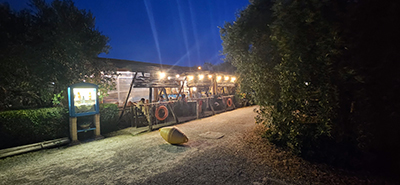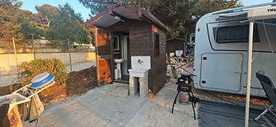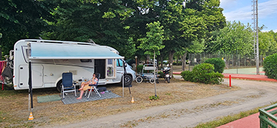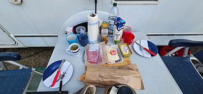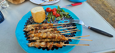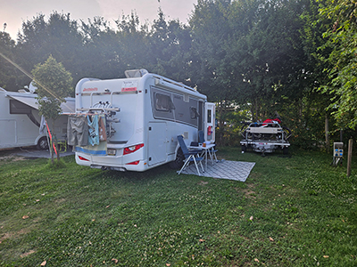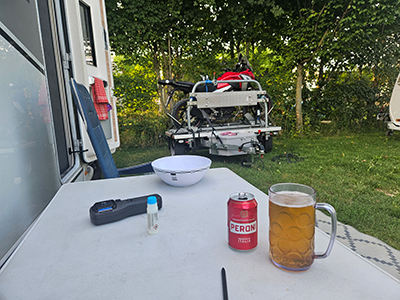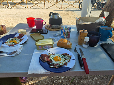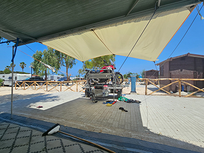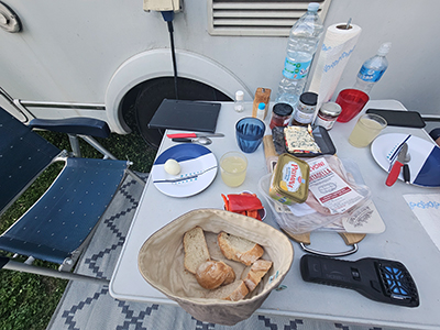 Die Nacht war zwar von der Temperatur angenehm gewesen, aber wie vermutet ist der Kopf nicht oder erst sehr spät schlafen gegangen. Dh. so richtig ausgeschlafen war ich nicht. Nach dem Frühstück haben wir die Honda verladen, die Heckgarage wieder einmal in einen vernünftigen Zustand gebracht, ein wenig Wasser für die Fahrt gefüllt und das angefallene Grauwasser entsorgt. Später sind wir dann am Strand baden und eine Siesta machen gegangen. Am Nachmittag war ein Boccia Turnier das die Animation organisiert hat, und für den späteren Nachmittag war wieder Yoga angekündigt. Eine gewisse Zeit ist so ein Campingplatz mit Animation ja lustig, aber ein ruhiger Agri Camping ohne das alles hat auch etwas. Wie bei allem machst es die Mischung aus. Wir sind heute etwas früher vom Strand gegangen, weil wir noch den Fisch grillen und dann auch den Griller putzen und verstauen wollten. Da wir morgen für uns sehr früh weg wollten wegen der weiten Strecke, haben wir heute bis auf Tisch, Sessel und den kleinen Teppich alles verstaut. Die Nacht war wieder warm, und der Gedanke uns über dem Bett einen Lüfter einzubauen wird immer stärker.