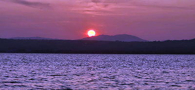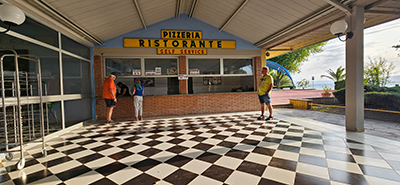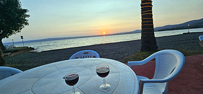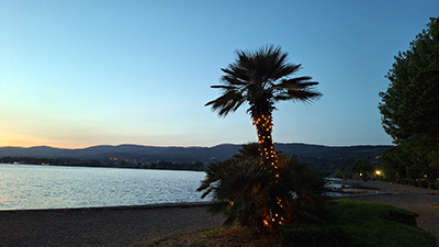 Da es in der Früh auch noch ein wenig geregnet hat, haben wir die Markise wieder rausgekurbelt um den Teppich und die Campingausrüstung nicht nass verstauen zu müssen. Gefrühstückt haben wir drinnen, und um 10:00 war der Spuk vorbei und es wurde wieder trocken und heiß. Um kurz vor 11:00 Uhr sind wir dann los. Es war wie immer auf der Strecke über den Apennin viel Verkehr, aber ab Florenz wurde es besser. Bei Orvieto sind wir auf eine kleine enge Straße abgefahren und quer durchs Land zum Campingplatz gefahren. Durch den Ort Bolsena wurde es noch ein wenig enger, aber es ist auch mit dem Hänger kein Problem wenn man ein wenig vorausschauend fährt. Am Campingplatz haben wir schnell eingecheckt, und dann noch den Stellplatz getauscht. Der zugewiesene Platz war schief und finster unter den Bäumen, der bevorzugte besser gelegen am Rand der Bäume. Somit war er heller und sogar mit Blick auf den See. Und da hier noch absolut nichts los war, war das Wechseln kein Problem. Auch hier war Fernsehen nur durch Streamen möglich, weil ein Baum für wunderbaren Schatten gesorgt hat, und zwar Sonne und SAT 🙂 . Und das WLAN am Platz ist schon vor ein paar Tagen wegen eines Defekts ausgefallen gewesen, und wann die Techniker kommen würden war nicht absehbar. Aber unser eigener Router hat für ein perfektes flottes Internet gesorgt 🙂 . Nach dem Einrichten und Abladen der Honda, bin ich ins nahe Restaurant etwas zu Essen holen gegangen. Am Weg dorthin habe ich auch noch das Brot für morgen im Shop vorbestellt. Ein kalter Meeresfrüchte Salat und zwei Pizzen sind mit mir zurück gegangen. Das System dort in der Vorsaison ist lustig. Man bestellt und sagt ob take away oder Vorort essen. Bleibt man Vorort. bekommt man ein Tischtuch und Besteck und sucht sich einen Tisch aus und geht dann zur Bar die Getränke holen. Wenn das Essen fertig ist, muss man es auch selbst abholen, bekommt es aber auf einem Teller und nicht wie beim take away in einer Schachtel. Die Pizzen waren abgesehen vom etwas „Keksartigen“ Boden recht gut und sehr preiswert. Am Abend sind wir noch in die Bar gegangen, haben unter den Palmen zwei Glas Rotwein getrunken, und den Sonnenuntergang über den See genossen. Der Platz war recht günstig, aber die Dusche kostet 1 € für 4 Minuten zusätzlich und die Automaten funktionieren nicht immer. Dh. eine zweite Münze mitnehmen erspart manchmal den Weg retour zum Wohnmobil 🙂 , und da man sowieso immer ein paar Münzen mehr als bezahlt bekommt, ist es auch nicht schlimm wenn es einmal einen Ausfall gibt. Die Nacht war ungewohnt laut 🙂 . Es haben die ganze Nacht die Frösche gequakt, die Vögel gezwitschert und mein spezieller Freund die Zwergohreule war auch aktiv. Aber das hat alles nicht gestört sondern war Musik der Natur, die uns in den Schlaf gewiegt hat :-).
