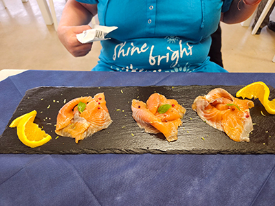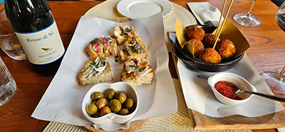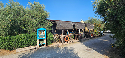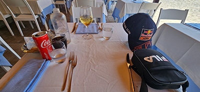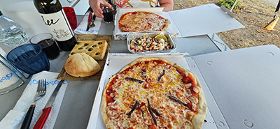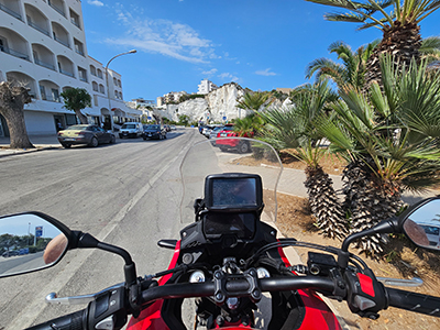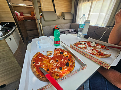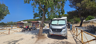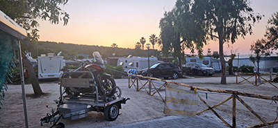 In der Früh bin ich wieder das Brot holen gegangen, und musste wieder lachen über die Schreibweise meines Namens. Die Dame an der Kasse hat ihn zwar am ersten Tag richtig vom Ausweis abgeschrieben, aber es wurde mit jedem Tag ein wenig kreativer 🙂 . Nach dem Frühstück haben wir noch ein wenig geputzt, alles entsorgt und um kurz vor 12:00 Uhr sind wir los. Da wir nur wenige Kilometer hatten, haben wir uns Zeit gelassen um nicht in eine eventuelle Mittagspause des nächsten Platz zu kommen. Die Straße war anfangs eng und in einer Ortsdurchfahrt hatten wir an einer verparkten Stelle einen Stau weil es einspurig war. Aber mit ein wenig Härte und Ellbogen ausfahren, sind wir dann dort auch durchgekommen. Bis zur Autobahn war die Straße teilweise sehr bescheiden und in einem Zustand der für ein Wohnmobil mit Anhänger eigentlich nichts ist. Nach einem kurzen Stück Autobahn, sind wir schon wieder abgefahren und die ersten Kilometer der Straße war noch mieser. Außerdem war dort sehr dichter Verkehr auf der engen Straße und alle hatten es eilig (außer uns 🙂 ). Vor Sperlonga sind wir zuerst in eine kleine Gasse abgebogen, dann noch einmal in eine noch kleinere und dann sind wir direkt vorm Tor des Agri Camping gestanden. Die Einfahrt war spannend, vor allem wenn man etwas länger ist. Mehr als 7 Meter Länge macht dort sicher ein Problem. Die Begrüßung war super freundlich und der Platz den er uns reserviert hat ein Traum. Aufgrund unserer Angaben (7m Mobil plus 2,5 m Anhänger mit Enduro) hat er uns den letzten Platz in der Ecke gegeben. Der war sehr groß und super zum Zu- und Abfahren. Wir sind unter Olivenbäumen gestanden, mit Strom, Wasser und einer eigenen Entsorgung für WC und Grauwasser. Neben uns sind zwei Wiener mit einem Dach Zelt auf ihrem PKW gestanden, und sonst waren die Nationalitäten bunt gemischt. Der Platz war ziemlich voll, aber da es in Summe nur 10 oder 15 Plätze gab, war das kein Problem. Ohne vorher zu Reservieren hätten wir Pech gehabt. Es hätte ein kurzes Stück weiter in der Gasse auch noch einen Stellplätz vom selben Betreiber gegeben, der kleinere und nicht so gut ausgestattete Plätze hatte. Das Essen im Restaurant am Platz war gut und günstig und wir haben für den Abend gleich einen Tisch reserviert, Es gab für uns Bruschetta mit Fisch, kleine Fischbällchen, einen gegrillten Thunfisch mit Rosmarin Kartoffeln und ein Schweinesteak mit Grillgemüse. Dazu haben wir uns eine lokale Flasche Rotwein gekauft und den Rest davon später zum Wohnmobil mitgenommen. Den Abschluss machte ein Limoncello Spritz mit selbst gemachten Limoncello, ein Getränk das bei uns dem Aperol Spritz absolut den Rang ablaufen wird. Die Nacht war sehr heiß und wir haben zeitenweise sogar die Klima aktiviert, weil es für uns sonst zum Schlafen zu warm war.