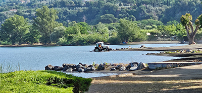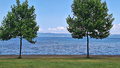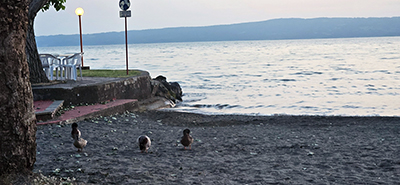 In der Früh bin ich das Brot holen gegangen und dann haben wir gefrühstückt. Bald musste die Markise raus, da die Sonne durch die Bäume kam. Die Bäume haben geblüht und deswegen ist laufend etwas klebriges herunter getropft, aber mit Wasser war es leicht zum Wegputzen. Gegen Mittag sind wir mit der Honda los und haben den See im Uhrzeigersinn umrundet. Da wir immer so nahe wie möglich am See und hauptsächlich auf kleinen Straßen unterwegs waren, hatten wir viele Schotterstraßen mit Millionen künstlichen Bodenwellen gehabt. Es war auch hier heiß, aber nicht so drückend heiß und schwül wie in Padua. Bei der Suche nach einem Lokal sind wir gescheitert, entweder waren sie voll oder schon zu, so sind wir selbst in Bolsena Einkaufen gegangen. Zurück beim Wohnmobil gab es dann den restlichen Meeresfrüchtesalat von gestern, und Nudeln mit (fertigem) Enten Sugo und Parmesan. Und danach noch toskanische Keks mit Marmelade als Nachspeise. Danach haben wir wieder eine Siesta gemacht, unterbrochen nur durch ab und zu baden gehen. Heute war ein wenig mehr am Platz los, weil einige Italiener gekommen sind. Aber mehr als viertel voll, wenn überhaupt, war der Platz noch nicht. Aber der Lärmpegel war durch die Italiener schon um einiges höher 🙂 .