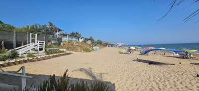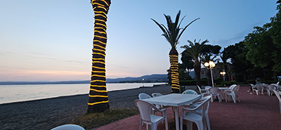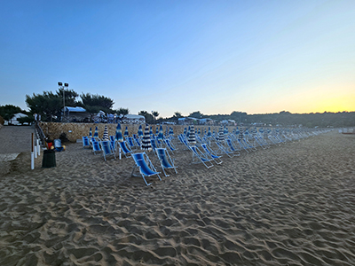 Heute war irgendwie schon beim Munterwerden klar das das ein fauler Tag werden würde 🙂 . Zum Frühstück hat es Ham & Eggs und viel Obst als Ausgleich gegeben, und dann sind wir bald hinunter auf den Strand gegangen. Heute war es besonders heiß, und der Wind war auch recht kräftig so dass fast alle ihre Markisen eingefahren haben. Auch heute hat es wieder den Yoga Kurs gegeben, und davor ein Fußballmatch der Animateure am Strand. Irgendwie ist da einfach nichts mit Siesta am Strand, weil immer was los ist 🙂 . Abends wurde der Wind noch ein wenig mehr, und so sind wir ins Lokal essen gegangen. Es war gut, viel zu viel und die Nonna in der Bar hat mir auf italienisch erklärt wie sie ihren ausgezeichneten Limoncello macht. Zurück beim Wohnmobil haben wir die Klima aktiviert, weil der Sturm zu stark zum Öffnen der Dachluken war. Da hätte ich Angst um die Klappen gehabt. Bis ca. 02:00 haben wir sie laufen lassen, dann wurde der Wind schwächer und wir haben wieder alles aufgemacht und auf unsere Akku Ventilatoren umgestellt.