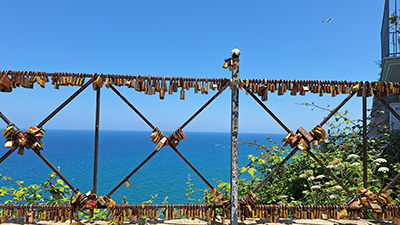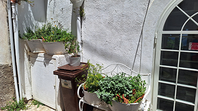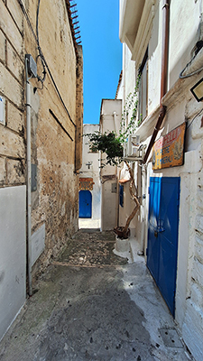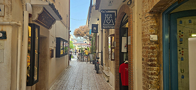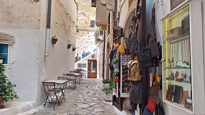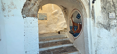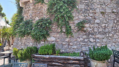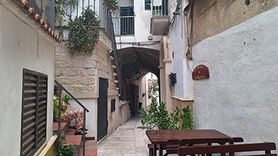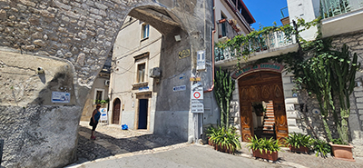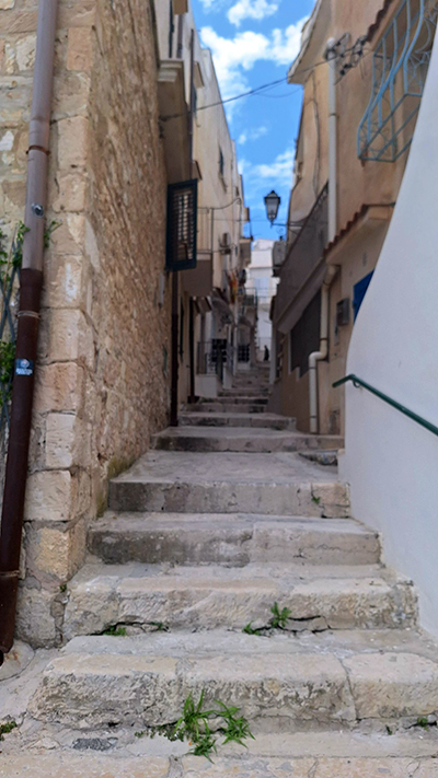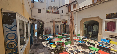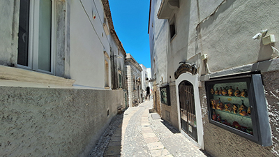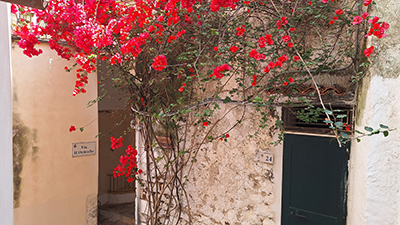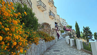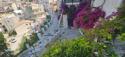 Nach dem Frühstück wollten wir heute wieder einmal ein wenig herumfahren und uns Sperlonga anzusehen. Man fährt bis auf den Hügel hinauf, und dann bei der nicht aktiven zona traffico limitato vorbei eine kleine Straße hinunter bis zum Meer. Dort bin ich stehen geblieben um mich ein wenig zu orientieren und gleich von einer bissigen Politesse überfallen worden. Pfeifen, Winken, usw. und nachdem wir sie ignoriert haben ist sie gekommen. Man muss aber sagen, ich bin absolut niemand im Weg gestanden, und es war außer dem Drachen auch nichts los 🙂 . Schlussendlich hat sie uns zu einem Parkplatz für Motorräder geschickt, happy das wir endlich gefahren sind. Sie hat aber auch jeden Lieferwagen oder PKW vertreiben versucht, der dort zum Ein- oder Ausladen stehen geblieben ist. Versucht deswegen, weil die sie noch viel mehr ignoriert haben als wir zuvor, wirklich ernst genommen hat sie niemand 🙂 . Es gibt unzählige keine Wege mit noch mehr Stufen den Hügel hinauf. Überall blüht es und die Gässchen sind ein Traum. Und die Aussicht auf den Strand war auch nicht ohne, aber die Temperatur auch nicht 🙂 . Ganz oben in einem Café haben wir uns hingesetzt und etwas getrunken. Warum ich keinen Cappuccino bestellen konnte, obwohl am Nebentisch gerade einer serviert wurde, hat mir die wortkarge nur italienisch sprechende Kellnerin nicht vermitteln können. Es war auch noch nicht nach Mittag, wo die Italiener so etwas normalerweise nicht mehr trinken. 😉 . Eine Art Eiskaffee ist aber zu bestellen gewesen. Aufgeklärt hat es sich erst beim Gehen, als ich auf das WV gehen wollte. Da hat mir der englisch sprechende Kellner hinter der Bar gesagt dass sie gerade kein Wasser haben. Wieder unten sind wir in ein Restaurant etwas essen gegangen. Die Muscheln und Nudeln waren wieder einmal traumhaft und nicht teuer. Und wie im Reiseführer gelesen, gab es hier so gut wie keine Ausländer. Der Ort war fest in italienischer Hand und noch eher verschlafen. Nach dem Essen haben wir uns noch ein Eis gekauft, und beide noch nie eine so große Kugel ausgezeichnetes Eis für nur 2,5 € bekommen. Dann haben wir den Supermarkt besucht und ein paar Dinge eingekauft. Bei Verladen der Einkäufe ist mir aufgefallen dass bei Helgas Klapphelm das Visier bzw. der gesamte Klappmechanismus auf einer Seite lose war. Mit dem Werkzeug das wir mit hatten, ging das aber nicht zu richten, so hat sie es auf der Seite bis zum Campingplatz mit der Hand gehalten. Beim Campingplatz hat dann das Tor nicht funktioniert, und der Capo hat uns reinlassen müssen, schimpfend über sein Tor. Ich glaube wir haben in der Siesta gestört 🙂 . Wir haben zwar kurz diskutiert ob wir baden gehen, waren aber dann zu faul. Die Außendusche hat dann für eine Abkühlung gesorgt, und das Gras hat sich über ein wenig Wasser gefreut. Nach der Siesta habe ich den Helm von Helga zerlegt und wieder gerichtet, und dann haben wir uns noch ein kleines Abendessen gerichtet. Wir haben wieder das alte Brot geröstet und ein paar Bruschetta gemacht . Den schon obligatorischen Limoncello Spritz und ein Tiramisu gemeinsam haben wir dann im Restaurant konsumiert.