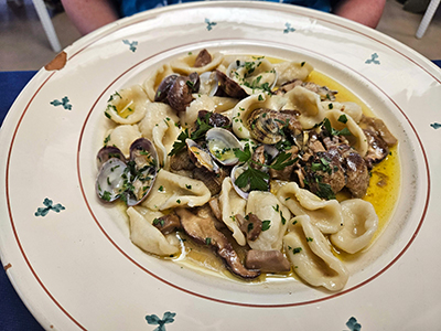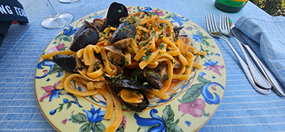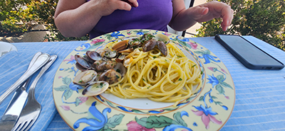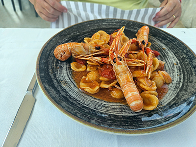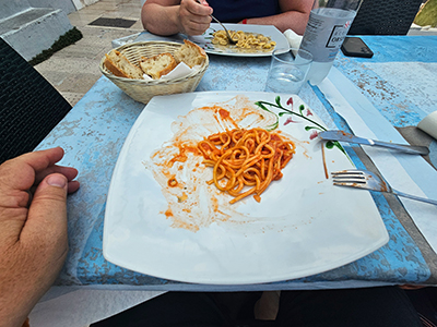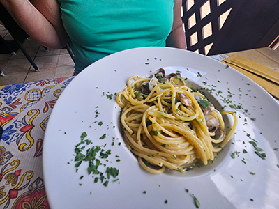 Auch heute war nach dem Frühstück, wieder ein Ausflug geplant, aber diesmal etwas weiter bis nach Gaeta. Man fährt immer der Küste entlang, auch durch ein paar Tunnel und es kommt fast ein wenig ein Gardasee Feeling auf (die Nord West Seite) aber es ist nicht so eng. Die Küste ist schön, die Strände riesig aber sehr erschlossen und alles ist voller organisierter Schirme. In Gaeta haben wir uns eingeparkt und sind in der Hitze einmal eine Runde gegangen. In einer Bar haben wir uns zwei Cola bestellt, da Helga ein menschliches Bedürfniss hatte. Irgendwie ist sie von dort aber nicht mehr gekommen und ich habe aus der Richtung ein lautes Klopfen gehört. Ich wollte gerade einmal per Telefon nachfragen wo sie bleibt, als die Kellnerin plötzlich los in Richtung WC geschossen ist. Die WC Türe ist von innen nicht mehr aufgegangen, und Helga somit nicht mehr herausgekommen. So etwas kann auch nur meiner Frau passieren, aber fairerweise muss man auch sagen sie war unschuldig 🙂 . Nach dem Austrinken der Cola sind wir noch ein Stück weiter gegangen bevor wir wieder retour zur Honda sind. Direkt daneben war ein Lokal mit super Blick auf das Meer, so haben wir uns wieder unsere Nudel gegönnt. Und weil die Muscheln so super ausgesehen haben, haben wir uns eine Portion Muscheln davor geteilt. Die Portion war riesig, wir haben bis zum Zahlen nicht gewusst ob wir eine oder zwei Portionen bekommen haben, und die Nudeln waren auch genial. Beim Zahlen sahen wir dass es wirklich nur eine Portion war 🙂 . Zurück beim Wohnmobil haben wir wieder eine Siesta gemacht. Danach habe ich die Honda verladen und Helga ein wenig geputzt, und danach haben wir den Tag gemütlich ausklingen lassen.