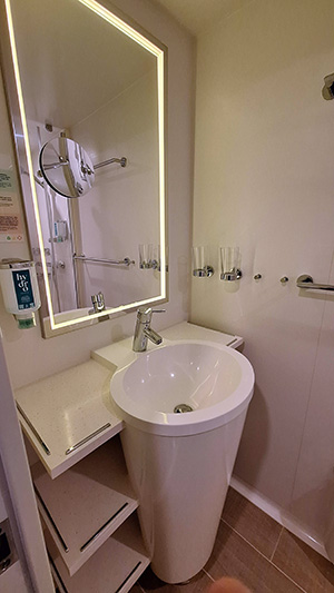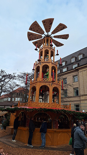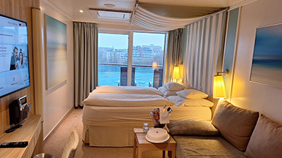 Um 04:20 ging der Wecker ab und wir haben uns fertig gemacht, soweit das um die Zeit überhaupt geht 😉 . Kurz vor 05:00 haben wir in der Rezeption ein Frühstückspaket aus gefasst, und sind wieder zum Terminal 3 gegangen. Die Sicherheitskontrolle haben wir schnell hinter uns gebracht, auch die vollen Wasserflaschen waren kein Problem. Dann gab es das Frühstück aus der Box und Kaffee und Tee aus einem nahen Shop. Um 06:50 ging das Boarding los und wie immer hatten alle zu viel Handgepäck mit. Unsere beiden Rucksäcke waren kein Problem, sonst haben sich aber Tragödien abgespielt weil einfach zu wenig Platz in der A320 der AUA war. Der Flug war ruhig, und die Verspätung durch das notwendige Enteisen haben wir fast aufgeholt. Der Flughafen Hamburg war um vieles freundlicher als zum Beispiel Frankfurt. Unser Gepäck ist rasch gekommen, und war durch die kreuzweise montierten bunten Gurten gut erkenntlich. Durch den eingepackten Tracker wusste ich auch immer wo die Koffer sind, und dass sie sicher mitgekommen waren. Nach dem Zoll sind wir schon von einer Frau mit Eurotours Schild begrüßt worden und auch gleich zum Shuttle Bus gebracht worden. Da scheinbar eine Schweizer Maschine ausgefallen ist, waren wir nur zu zehnt im großen Reisebus. Im Bus war es die 90 Minuten bis Kiel sehr ruhig, da alle Österreicher sehr früh aufgestanden sind. Um ca. 11:30 sind wir beim Kreuzfahrt Terminal im Hafen gewesen. Dort haben wir dann die Aida Kofferanhänger mit der Kabinennummer auf die Koffer montiert, und die beiden großen Koffer bei der Gepäckabgabe der Aida eingecheckt. Unsere Check in Zeit war aber erst von 14:00 bis 15:00, deswegen sind wir nach Kiel in die Innenstadt spaziert. Dort haben wir einige Weihnachtsmärkte besucht und auch eine Kleinigkeit gegessen. Sowohl Helgas Matjes Brötchen, als auch meine Fischsuppe war ausgezeichnet. Das Speisen Angebot war ausgezeichnet, an jedem Stand hat es etwas anderes gegeben. Hier findet sicher jeder etwas. Wir sind dann noch ein paar Weihnachtsmärkte bis zum Bahnhof besuchen gegangen, bevor wir zum Terminal zurück gegangen sind. Um kurz vor 14:00 Uhr haben wir uns wieder angestellt und sind zum Check in. Der gesamte Check in dauert etwa eine Stunde und läuft ähnlich wie am Flughafen ab. Es werden die Tickets und Pässe kontrolliert, und es gibt auch Scanner für Handgepäck und Personen. Danach darf man mit seiner Key Card auf das Schiff. Am Schiff war es ein wenig chaotisch, da irgendwie die, die das erste Mal mit Aida reisen, nicht wirklich gut abgeholt werden. Dazu kommt noch, das die App, die alles erklären würde oft nicht funktioniert, und das Wlan sich anfangs auch nicht verbinden ließ. Vom gebuchten Internet will ich gar nicht reden, das ist erst irgendwann gegangen. Aber es war kein Problem von uns oder unseren Geräten, auch die Angestellten kamen nicht ins System. Man erhält dann irgendwann eine SMS, oder auch nicht, das die gebuchte Kabine bezugsfertig ist. Wir sind einfach schauen gegangen wie der Stand ist, und unsere war so gut wie fertig :-). Das SMS ist aber erst Stunden später gekommen. Die Aida App in der man alles sieht, bucht und alle Infos bekommt, war die ganze Reise ein Ärgernis und hat oft nicht funktioniert. Das Internet war teuer, wenn es funktioniert hat zwar schnell, aber man musste sich oft neu anmelden weil man wieder rausgeflogen ist. Machen wir so etwas noch einmal, würde ich beim gratis Wlan ohne Internet für die App bleiben, und mir bei Red Bull Mobile einen eSim mit einem für das Schiff passenden Maritim Guthaben kaufen. Das ist flexibler, billiger und funktioniert besser, und kann auch mit einem Hotspot an andere Geräte weitergeteilt werden. Beim Aida Internet geht das nicht, da muss man immer die Geräte an und abmelden, wenn man wechseln will (oder eine andere kreative und vermutlich nicht ganz legale Lösung wie Bluetooth Tethering 😉 finden). Und wenn zu dem Zeitpunkt wo man wechseln will, die App wieder einmal streikt, geht das Wechseln nicht. Die Kabine war schön und immer super sauber, und das WC und Bad getrennt waren, ist auch super. Die Terrasse ist relativ groß und hat zwei Sessel und eine Hängematte, aber zum Sitzen ist es um die Zeit ein wenig zu kalt und zugig. Aber es ist trotzdem recht angenehm zum Schauen und Frischluft schnappen. Und man muss sich nicht mit anderen um einen Platz streiten, wenn man in einen Hafen einläuft, sondern kann bequem von der Terrasse oder auch vom Bett aus, rausschauen 🙂 . Am Abend sind wir in eines der inkludierten Buffet Restaurants gegangen. Wenn man etwas azyklisch oder sehr früh geht, findet man immer sofort einen Tisch, sonst kann es sein das man ev. kurz warten muss. Das Essen ist gut, viel, die Buffets sind immer sauber und es wird sofort nachgefüllt wenn etwas fehlt. Am Tisch bekommt man sofort gratis Wasser und eine Liter Karaffe mit einem Tischwein, Bier, Softdrinks usw. kann man sich selbst nehmen (auch inkludiert). Nur höherwertige Getränke, bessere Weine und Kaffee (außer dem Filterkaffee zum Frühstück), muss man zahlen. Wobei sowohl der Filterkaffee als auch der teure Kaffee aus dem Automat dünne fade Wässerchen sind. Dh. wenn man ein Kaffee Junkie ist, sollte man das Angebot eine Nespresso Maschine fürs Zimmer zu mieten, ev. ins Auge fassen. Die vielen Shows und Veranstaltungen die jeden Tag laufen, haben wir heute nach dem Essen links liegen gelassen, da wir beide schon ziemlich müde waren. Die Nacht war ruhig und wir haben super geschlafen.