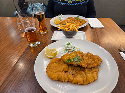 Am Freitag Mittag, nach der Arbeit, sind wir mit unseren Koffern von zuhause Richtung Murpark gegangen. Beim Bahnhof Murpark sind wir in die S-Bahn gestiegen und weiter zum Hauptbahnhof gefahren. Am Hauptbahnhof haben wir den Bahnsteig gewechselt und sind zum schon bereitgestellten Zug nach Wien gegangen. Die Zugkonfiguration dürfte sich aber kurzfristig geändert haben, denn den Wagon und die von uns reservierten Sitzplätze hat es nicht gegeben. Wir haben aber in der ersten Klasse zwei andere Plätze gefunden. Die Fahrt nach Wien war unspektakulär und am Semmering hat es eine kleine Jause gegeben. In Wien Schwechat sind wir ausgestiegen und gleich zum Flughafen hinüber gegangen. Dort haben wir eingecheckt und schon unsere schweren Koffer abgegeben. Dann sind wir zum NH Vienna Airport Hotel gegangen. Da der Flug morgen recht zeitig in der Früh war, sind wir schon einen Tag früher los und haben am Flughafen ein Zimmer gebucht. Dort haben wir dann einmal 10 Minuten bei der Rezeption verbracht, weil die Reservierung von Eurotours nicht auffindbar war. Laut dem Rezeptionisten ist das aber oft der Fall. Er hat uns trotzdem das Zimmer gegeben und erklärt dass er sich später um die Reservierung kümmert. Der Ausdruck den wir mit hatten, hat ihm gereicht. Nach dem Bezug des Zimmers, sind wir wieder ins Terminal 3 gegangen, und haben im Restaurant Puck ein ausgezeichnetes Schweins Wiener mit Pommes und Salat und eine Crème Brûlée verspeist. Danach sind wir bald schlafen gegangen, da wir morgen sehr früh raus mussten.