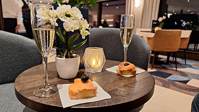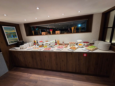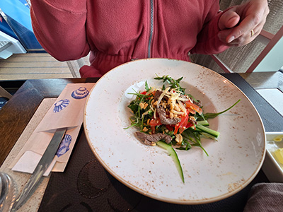 Da es in der Nacht und am Vormittag kräftig geschneit hat, haben wir die mit dem eigenen PKW geplante Anreise abgesagt. Es war sowohl die Südautobahn, als auch die Semmering Schnellstraße, dauern gesperrt wegen hängengebliebener LKWs und selbst wenn sie offen waren, war dort viel Stau. So haben wir umgeplant und wollten sicher gehen und mit dem Zug fahren. Laut ÖBB App war noch alles ok zu dem Zeitpunkt, was aber nicht ganz die Wahrheit war. Der Weg zur Straßenbahn war „super“, weil unsere Nachbarn wie üblich nicht geräumt haben, und die öffentlichen Gehwege auch eher schlecht geräumt waren. Dh. die Rollkoffer sind nicht gerollt, sondern waren eher Schneeschieber und mussten somit getragen werden 🙁 . Mit der Straßenbahn zum Bahnhof ging es überraschend gut, aber dann wurde es spannend. Bis auf unseren geplanten Zug, sind alle andeen nach Wien mit Bombenverspätung oder gar nicht gefahren. Dh. unser Zug musste laut Schaffner die Passagiere von drei Zügen mitnehmen. Unser Abteil in der Ruhezone in der ersten Klasse war aber fast leer, während hinten in der zweiten Klasse einige nur einen Stehplatz ausgefasst hatten. Nach dem ganzen Stress und Umplanen haben wir uns ein Wiener im Zug gegönnt, bevor wir in Wien wieder in den Trubel hinaus sind. Mit der übervollen U-Bahn sind wir gut bis zur Donau, Station Vorgartenstraße gekommen, bevor es wieder anstrengend wurde. Hier war es gleich gut oder schlecht geräumt wie in Graz, dh. es war teilweise wieder Koffer tragen angesagt. Helgas Rollkoffer hatte mehr Bodenfreiheit und ist so halbwegs gefahren, mein kleinerer eher nicht. Aber das hat uns nicht aufgehalten und um 14:30 waren wir beim Schiff. Der checkin begann zwar erst um 15:00 Uhr, aber da hat man schon den ersten Unterschied zur Aida gesehen. Statt uns warten zu lassen, wurden uns sofort die Koffer abgenommen und auf die Kabine gebracht, und wir in die Bar auf ein Getränk geschickt. Und alles mit sensationeller Freundlichkeit und nicht mit dem herben norddeutschen Charme. Kurz darauf wurden wir schon wieder abgeholt und wir konnten Einchecken und unsere Kabine beziehen. Nach einer kurzen Pause sind wir wieder in Bar, und haben dort auf den Begrüßungscocktail und die Infoveranstaltung gewartet. Am Schiff ist wirklich all inklusive, dh. außer wenn man in den Spa oder sich massieren lassen will, oder einen Ausflug bucht, ist alles inkludiert. Das geht von der laufend nachgefüllten Minibar, bis dazu dass man auch zehn Cocktails oder Champagner trinken könnte. Bei der Infoveranstaltung hat die Reisemanagerin alles mögliche erzählt, und auch die Hotelmanagerin und der Kapitän haben kurz gesprochen. Wobei die Ansprache vom Kapitän war wirklich kurz, ca. ganze drei Wörter 😊. Wir sind mit ca. 30 Minuten Verspätung losgefahren, da einige durch das Schneechaos und den am Vormittag gesperrten Flugplatz zu spät oder gar nicht gekommen sind. Die Reisemanagerin hat erzählt das einige erst morgen in Budapest zusteigen würden. Danach ging es direkt zum Gala Dinner in das große Lokal. Wir hatten unseren vierer Tisch für uns allein, und das Essen war gut und viel. Und es wurde serviert, dh. keine Schlacht am Buffett wie auf der Aida. Hier war es sowieso viel ruhiger und beschaulicher von der Stimmung, und es waren auch keine Kinder an Bord. Ob das Programm ist und Kinder gar nicht gebucht werden können, oder Zufall, kann ich nicht sagen. Nach dem Essen sind wieder in Lounge ober der Bar, wo ein älterer italienscher Musiker ausgezeichnet gespielt und gesungen hat und für Stimmung gesorgt hat. Die Nacht war ruhig und angenehm, außer dass es ein wenig warm in der Kabine war und die Betten ein wenig zu schmal sind (80 cm statt 90 cm wie zuhause).