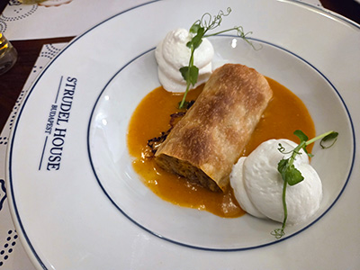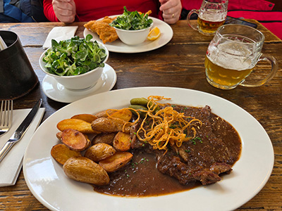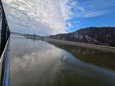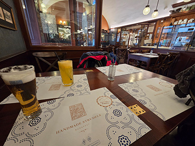 Beim Munterwerden in der Früh sind wir gerade am Anfang von Budapest gewesen. Angelegt haben wir nahe der Stelle, wo wir im September unsere Prosecco Schifffahrt gestartet haben. Nach dem Frühstück sind wir bei super Wetter los und der Donau entlang bis zum Parlament spaziert. Die Aussicht auf die vielen Gebäude auf beiden Seiten der Donau ist immer wieder ein Erlebnis. Nach dem Parlament sind wir abgebogen und zum Freiheitsplatz spaziert. Von hier ging es weiter zum Elisabethplatz und dann mit Hilfe vom Handy bis zur Vaci Utca. Am Weg dorthin sind wir im Strudel House eingekehrt und haben einem Könner zugesehen, wie er unzählige Strudel gemacht hat. Helgas Lachsstrudel war sehr gut, mein Hühnerstrudel war zwar gut vom Geschmack aber ohne die Paprikasauce hätte ich ihn nicht hinuntergebracht. Er war ziemlich trocken, aber das Krügerl Bier war dafür ausgezeichnet. Die Vaci Utca ist Budapests älteste Handelsstraße, und heute die bekannteste Flaniermeile in Budapest. Helga hat versucht ein paar Handschuhe als Ersatz für ihre noch immer von der Anreise feuchten Handschuhe zu bekommen, ist aber gescheitert. Es gab viel Mist, aber im Prinzip waren schon überall die Frühlingssachen in den Regalen und keine warmen Handschuhe mehr. In der Sonne war es zwar super angenehm und warm, im Schatten mit Wind aber doch noch kühl. Wir sind die ganze Straße entlang gegangen, bis zur großen Markthalle. Dort sind wir eine Runde gegangen und dann zurück zum Schiff spaziert. Inzwischen war es ziemlich kühl und dunkel am Himmel geworden und kurz vor dem Schiff hat es leicht zu nieseln begonnen. Nach dem Umziehen sind wir in die Lounge gegangen, zu Kaffee und Kuchen und einen Smoothey des Tages, und danach war der Zeitpunkt perfekt für eine kurze Siesta in der Kabine 😊. Vor dem Abendessen, das wir diesmal im italienischen Restaurant reserviert hatten, sind wir in die Lounge auf ein Glas Schampus gegangen – man gönnt sich ja sonst nichts 🙂 . Wenn es inkludiert ist, warum nicht ausnutzen. Um 19:00 Uhr hat das Schiff abgelegt, und wir konnten die schön beleuchteten Gebäude vom Tisch in der Lounge aus genießen. Um 19:30 sind wir in unser Restaurant gegangen. Das Essen war dort war auch ausgezeichnet, und danach ging es wieder in die Lounge zurück, wo der Musiker wieder für Stimmung gesorgt hat. Vermutlich e sogar für ein wenig zu viel Stimmung, den am nächsten Tag waren viele Gäste sehr müde und ab sofort alle Zwischentüren zu den Kabinen immer geschlossen. Bei den vorderen Kabinen war es vermutlich ein wenig zu lange laut gewesen und ein paar haben sich berechtigterweise aufgeregt. Von der Fahrt nach Bratislava haben wir wenig mit bekommen, aber nicht wegen dem Abend davor, sondern weil die Fahrt sehr unspektakulär und ruhig war.
